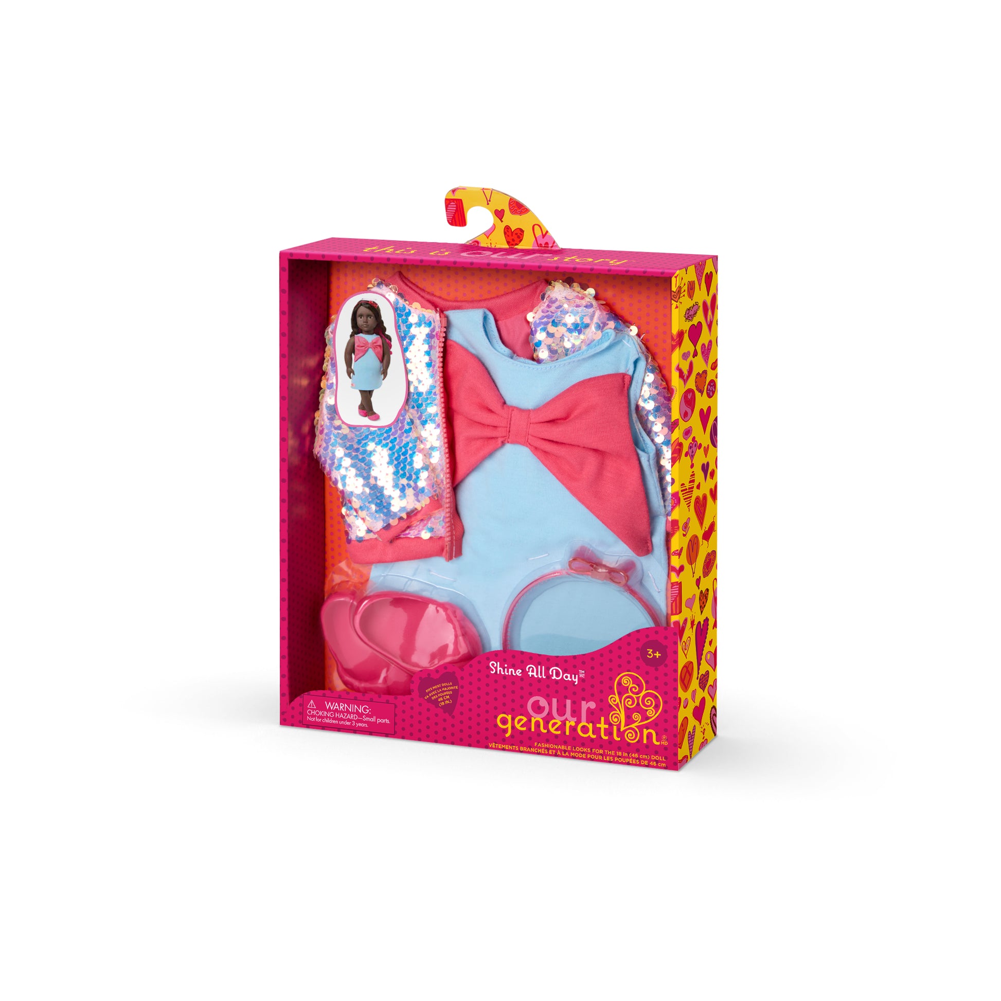 18-inch Doll Jacket Outfit: Make dress-up sparkle for fashion fans with the Our Generation Shine All Day outfit for 18-inch dolls! Child-Friendly Fashion: Includes a zip-front sequin bomber jacket, a dress with a large red bow detail, a matching headband, and pair of shoes for a complete outdoorsy look. Mix & Match: Doll clothing has easy-open closures to quickly put on and remove as kids explore imagination and self-expression. Compatible with most 18-inch dolls, doll clothes, and doll accessories. Recommended Age: This Our Generation doll clothing set makes a great gift for kids ages 3+ (small parts), encouraging them to create their own unique stories and styles. Doll Clothing Set Only: Our Generation dolls sold separately.