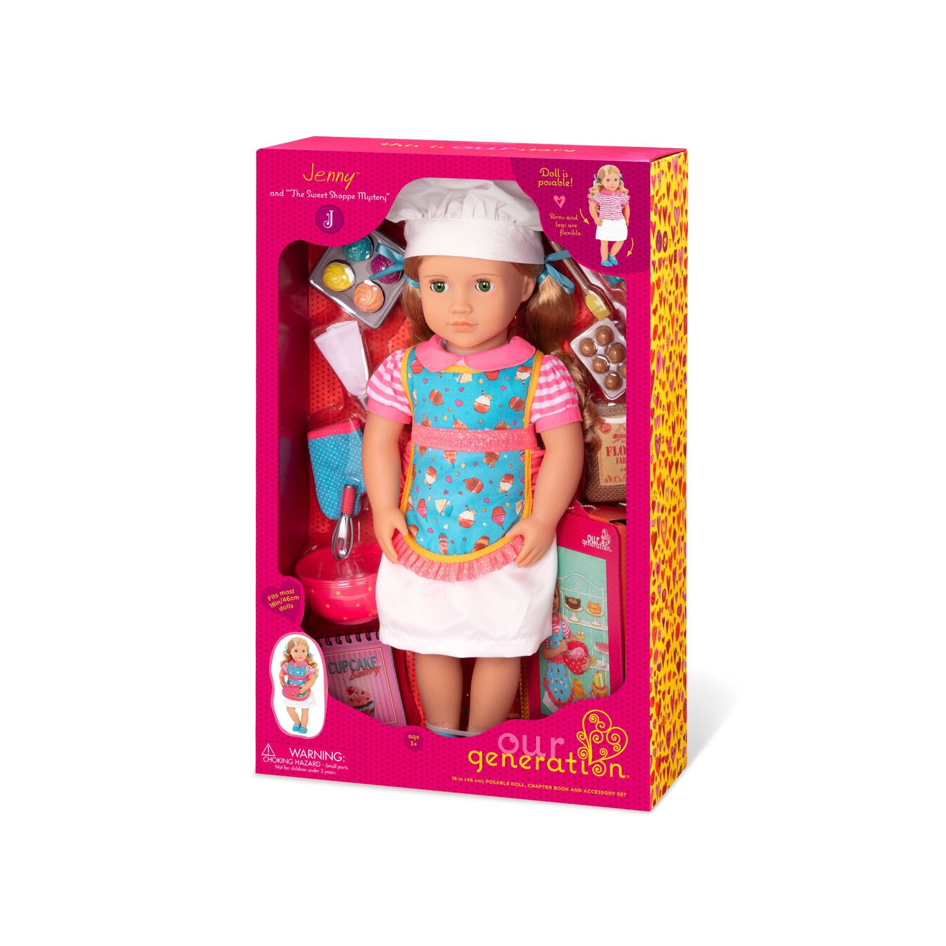 18-inch Baker Doll: cook up tasty fun with Our Generation doll Jenny! Detailed Features: beautiful green eyes that open and close with long, wavy blonde hair that's fun to style! Posable: huggable soft body with bendable arms and legs to easily change outfits and bake cupcakes! Beautifully Illustrated Storybook: follow Jenny's journey in her easy-to-read chapter book, The Sweet Shoppe Mystery! Includes: doll, outfit, apron, oven mitt, mixing bowl, rolling pin, 6 eggs, flour bag, sketch book, 2 hair ribbons, chef's hat, whisk, 4 cupcakes, tray, baking brush, egg tray, icing tube, storybook, and bookmark. Mix & Match: outfit features easy-open closures to quickly put on and remove; compatible with most 18-inch dolls, outfits, and accessories. Recommended Age: suggested for kids ages 3+ (small parts).